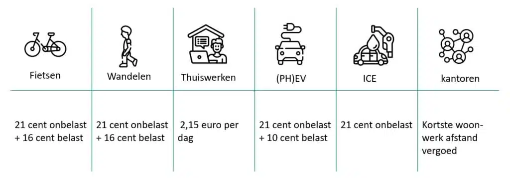 Tip: Wanneer je de kilometervergoeding voor brandstof voertuigen verlaagt naar bijvoorbeeld € 0,11 per kilometer dan houd je € 0,12 over die je netto kunt uitkeren aan de duurzame keuze, zoals de fiets.