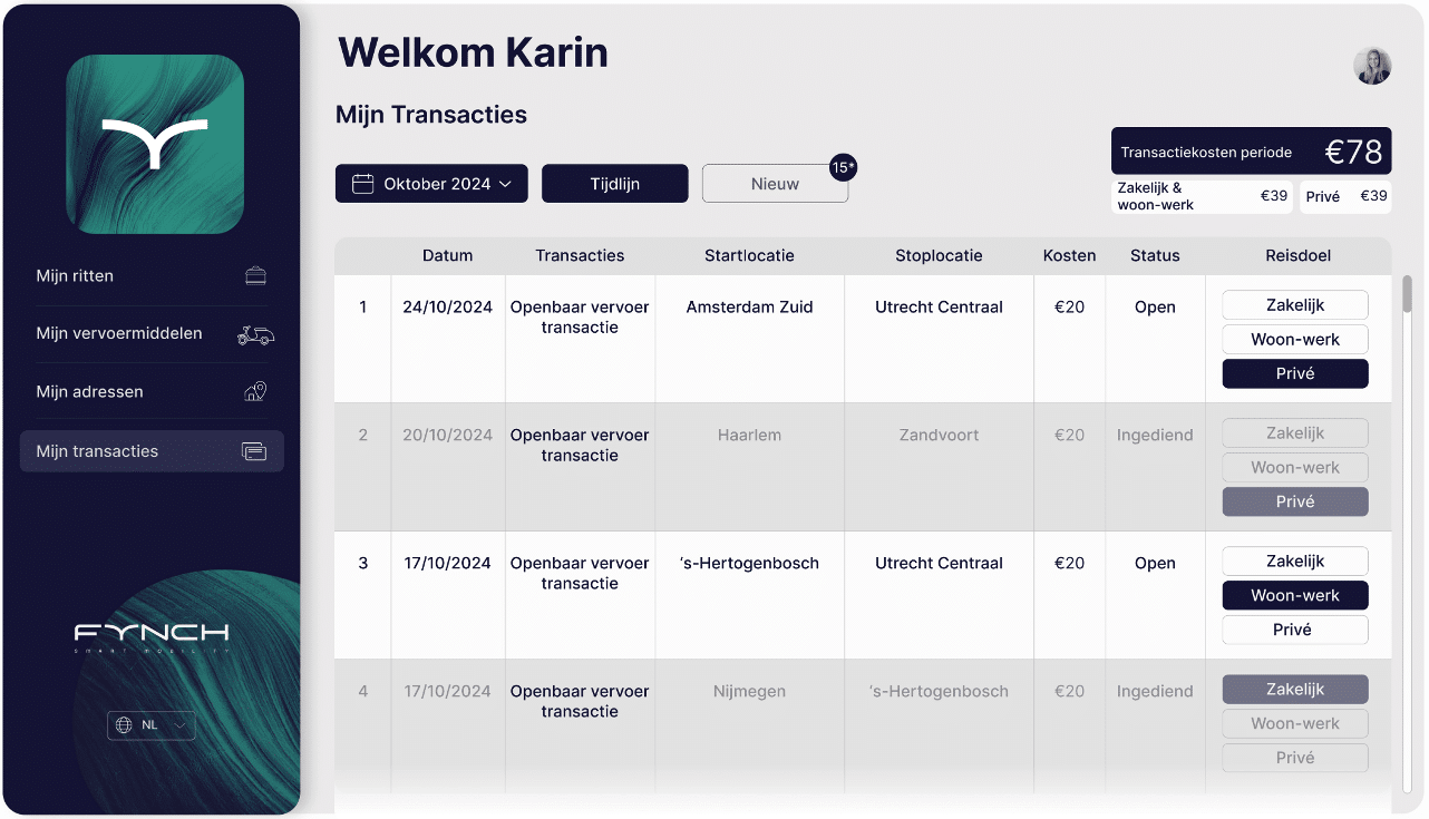 De NS-Business Card is volledig geïntegreerd in de Fynch app. Alle transacties komen in de Fynch App en de medewerker kan het reisdoel eenvoudig zelf kiezen.